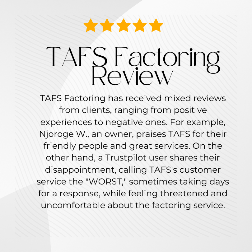 TAFS Factoring has received mixed reviews from clients, ranging from positive experiences to negative ones. For example, Njoroge W., an owner, praises TAFS for their friendly people and great services. On the other hand, a Trustpilot user shares their disappointment, calling TAFS’s customer service the “WORST,” sometimes taking days for a response, while feeling threatened and uncomfortable about the factoring service.